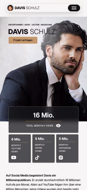 Davis Schulz ist Schauspieler, Musiker und Content Creator mit über 30 Millionen Followern. Ziel des Projekts war es, seine Persönlichkeit, seine Reichweite und seine vielseitigen Talente in einer starken digitalen Präsenz zu vereinen — klar, modern und auf Anhieb beeindruckend.
